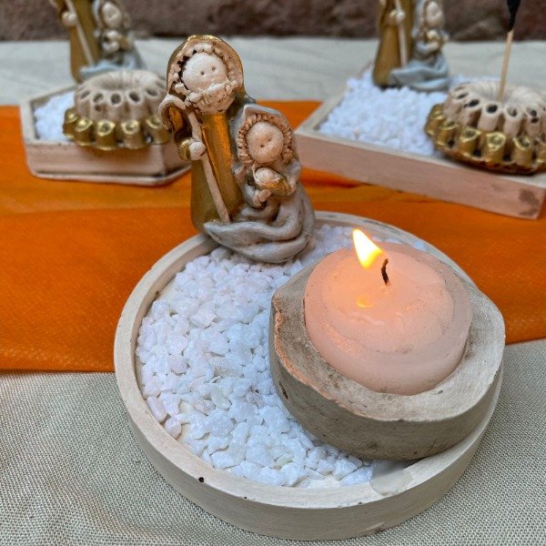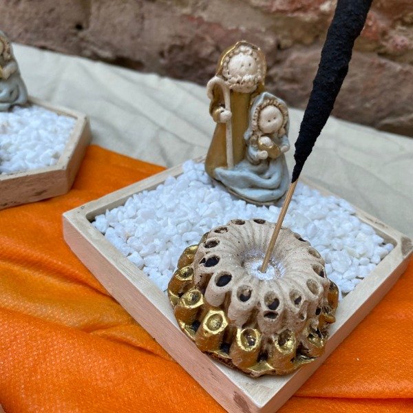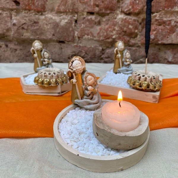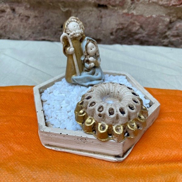 Pesebre 5 cm de alto, con base cuadrada, hexagonal o redonda, piedritas y porta vela o porta sahumerio.